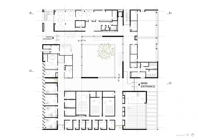 TEO provides a unique functional facility to the city’s art-practicing and culture-seeking residents. The plan is designed within a 50 by 50 m2 perimeter around an offset central patio surrounded by the various programs: a music conservatory, a dance school, art and ceramics studios, a gallery, a senior recreation center, and a cafeteria. An upper partial floor houses a library complemented by a 300 m2 open deck.