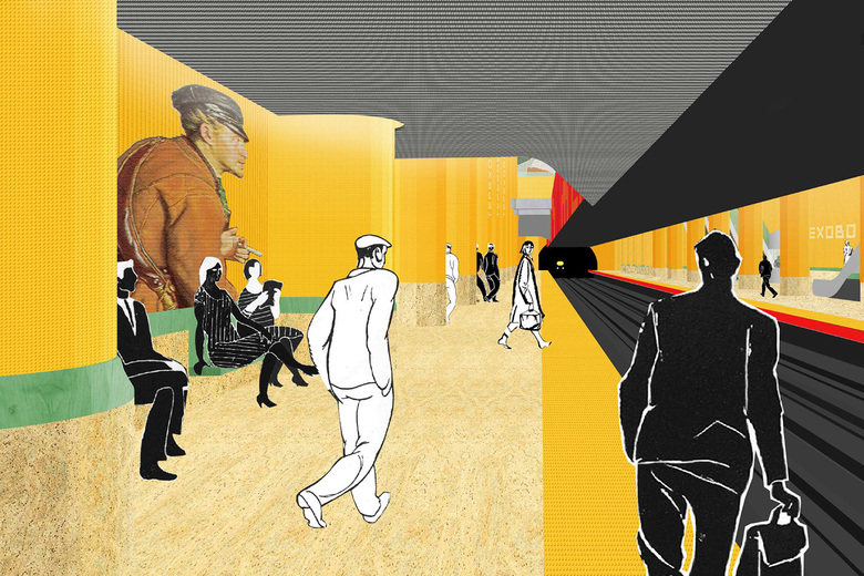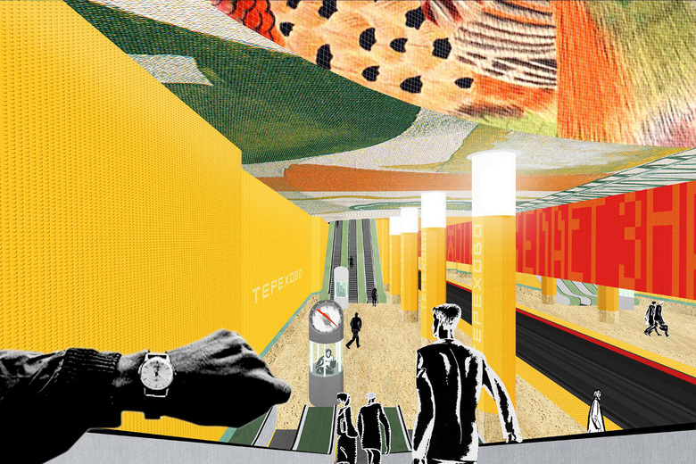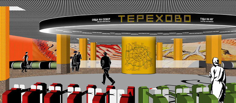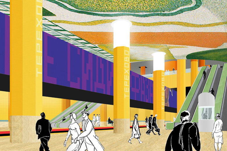 Terekhovo Metro Station, Moscow, Russia, Invited Competition, Stage I and II   Strelka KB, organizer. Austin+Mergold LLC with Andrew Fu, Aaron Goldstein, special thanks to Yuri Mergold, 2015, and with drawings from illustrated book Moscow by German Cheryomushkin, 1968.