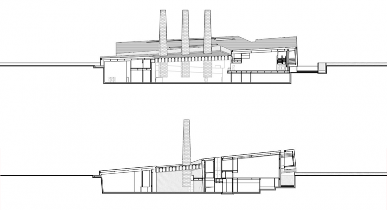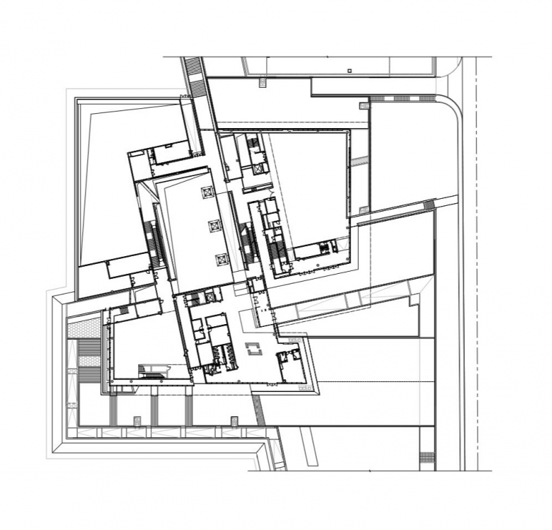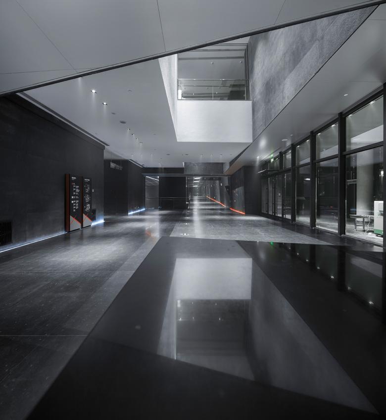 To relieve the repression caused by new building volume upon the site, the main display spaces are sunk into the ground. A cracked Black Box tilts on the collapsed site, making its charcoal grey roof an extension of the square ground. The “tilt” shows not only the scale but also the attitude of design. Viewing from the square in front of the office building into the east, the exhibition hall seems like a slight fluctuation in the terrain, more of a natural earth-scape than an artificial geometry. The crack creates subtle variations in form, color and material of the Black Box, which in turn help merge the building into the environment.