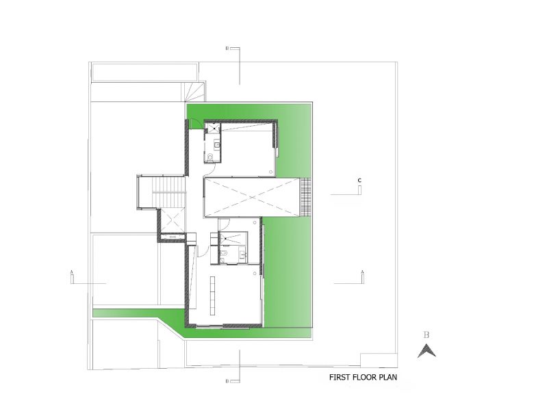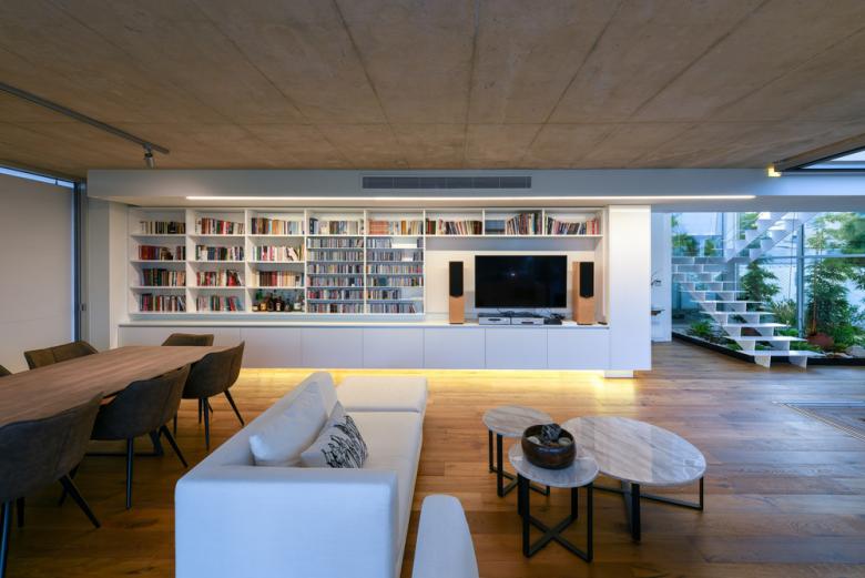 The integration of green areas into the house incorporates the planting of gardens on 60% of the ground floor, the use of green terrace on the first floor, the provision of bee-friendly landscapes and 40 kinds of native wildflowers. All areas inside flow on the outer spaces and are organized around a green central courtyard placed in-between two white cubic volumes. Making space for nature in the city not only brings beauty to the urban fabric but encourages the return of local bird species and bees maintaining thus urban biodiversity; furthermore, it promotes human health and well-being.