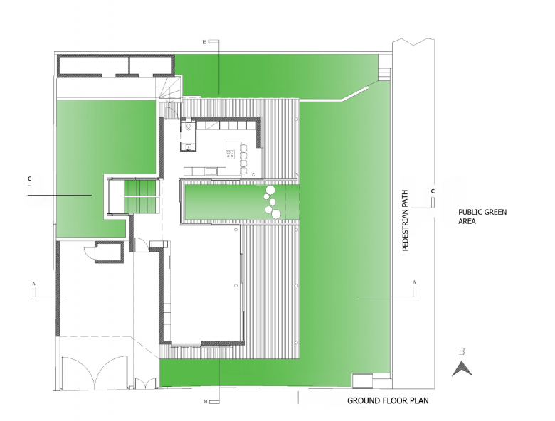 Not hiding behind fences and fully glazed on one side, our proposal aims to form a physical continuation of the adjacent public green area. The house seeks to establish a unified relationship between the neighborhood, the private garden and the public park. Urban elements such as building, street and public space are not treated as absolute activities in isolation but as one single homogeneous configuration as the house becomes part of the park and the park is included in the house.