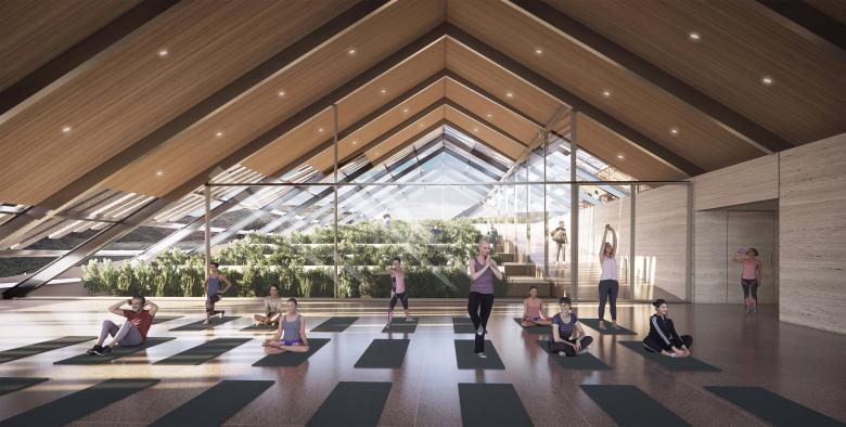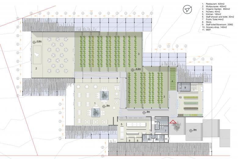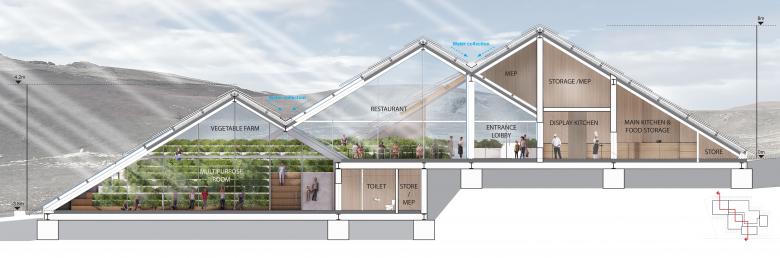 Three triangular volumes create three separate zones, one for the multifunction space, one for the restaurant and one for the service, and food preparation areas, which is positioned towards the eastern road for efficient maintenance and service access. The three functional building volumes are then unified and interconnected within one undulating stone roof, creating connectivity between the separate functions. All three of these zones are also brought together by a large central organic farm greenhouse. The organic greenhouse is fully glazed and visible throughout the building, offering views to guests of vegetable harvesting.