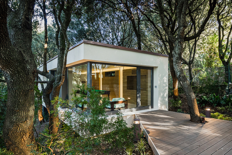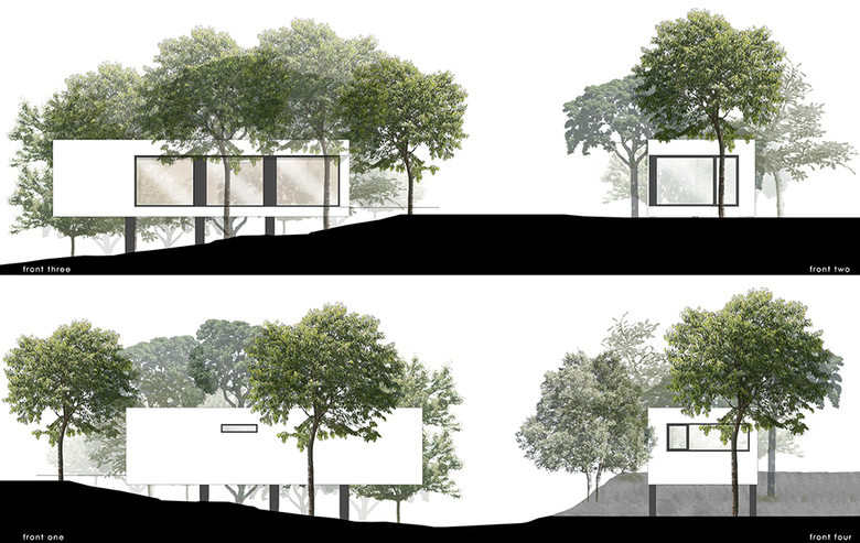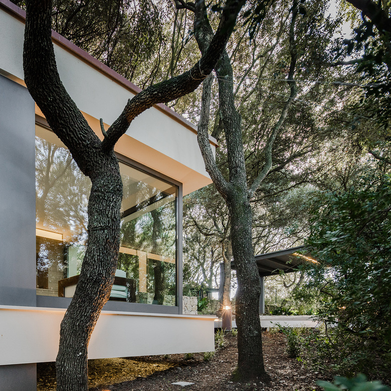 A suspended, simple orthogonal form of the house fits perfectly into the oak forest, a striking setting where the majestic trees surround and touch the building with its branches.