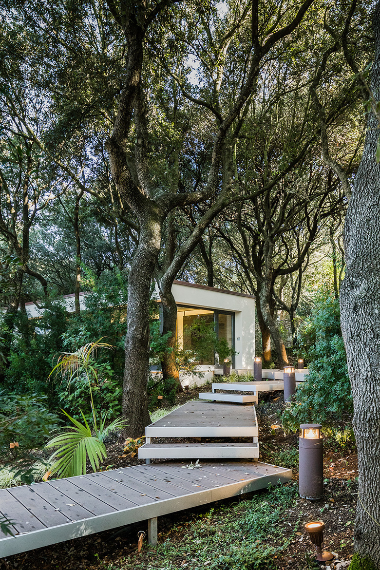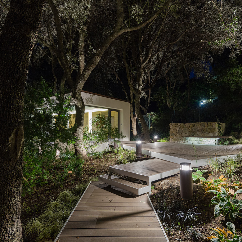 Wooden walkway marks a new path that flows through the trees between the main house and the new volume. It offers a new perspective to those who want to live outer space and becomes a place of rest and reflection, immersed in the tranquility of the forest-garden.