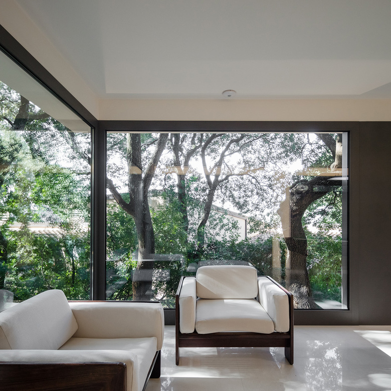 The openings are large and contemporary, and the glass walls reflect wonderfully the surrounding context, making it literally part of the interior.