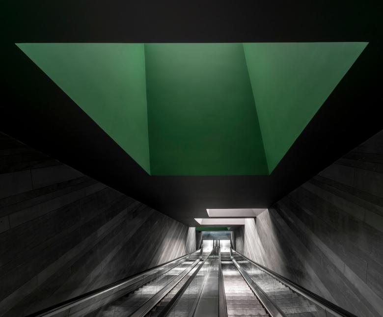 Visitors arriving from the subway station find themselves walking into an underground space, with the ceiling covered in metal tubes mimicking the roots of the forest above. A dramatic escalator tunnel with deep ceiling coves leads to the primary exhibition hall.