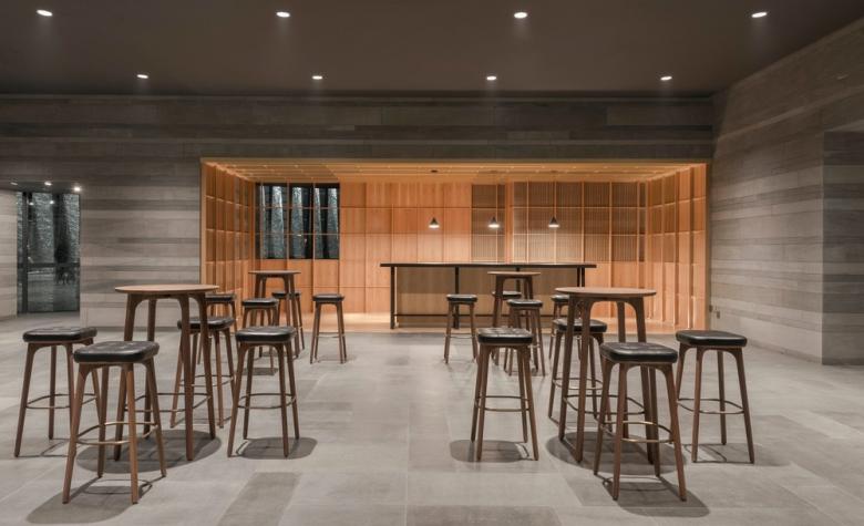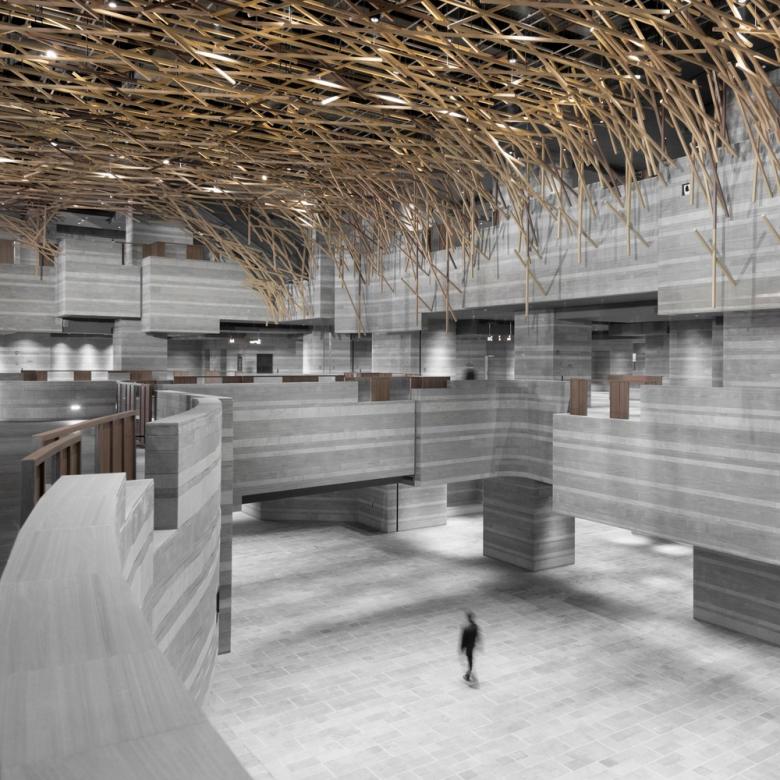 A floating canopy of wood sticks hovering over the three-story atrium transforms the space into a forest. Gallery openings are wrapped in interlocking solid sandstone and light walnut balustrades. The visitors experience is constantly alternating as one meanders along the cavernous galleries and bridges.
