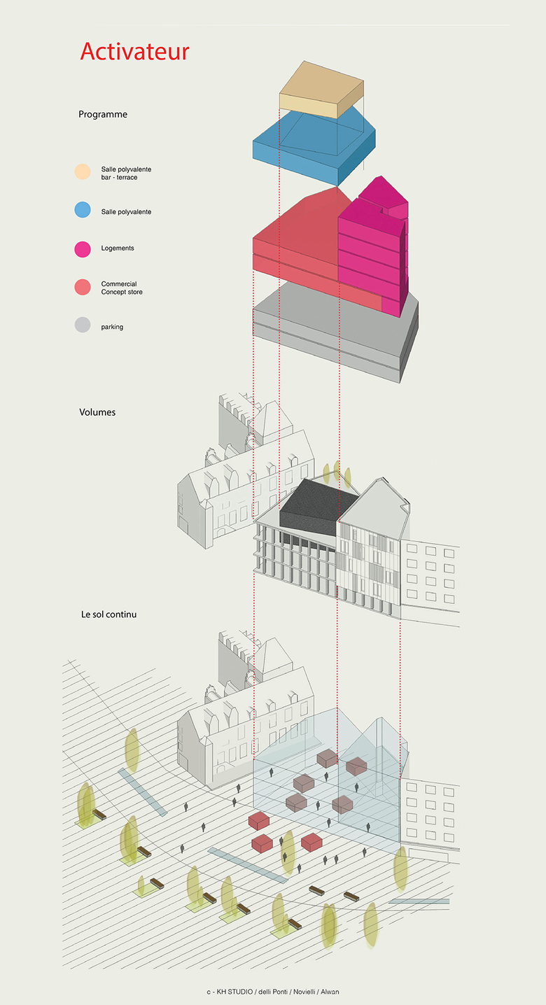 But Bellivet is also a laboratory of typological history, going from the medieval Hotel de Than to the modernist building of the chamber of commerce, stepping through elegant 19th century housing buildings. The variegated façade-line of Bellivet presents a hidden urban potential: two courtyards, connected to key public spaces but currently used as parking areas, the property of which is divided among multiple owners.