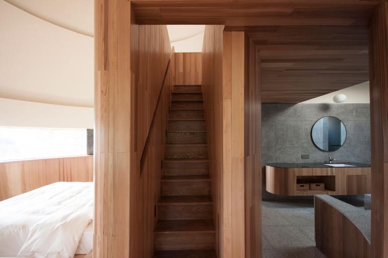The bathroom and storage space are arranged in a simple rectangular volume, which is inserted into the main body of the Mushroom. A horizontal window is designed next to the bathtub, avoiding the view from pedestrian path to ensure privacy, while bringing nature into the space. Meanwhile, the circular skylight at the top introduces different expressions of light and shadows with the change of time and weather. This poetic space also serves as the entrance lobby of the house, where the guests often visit and linger.