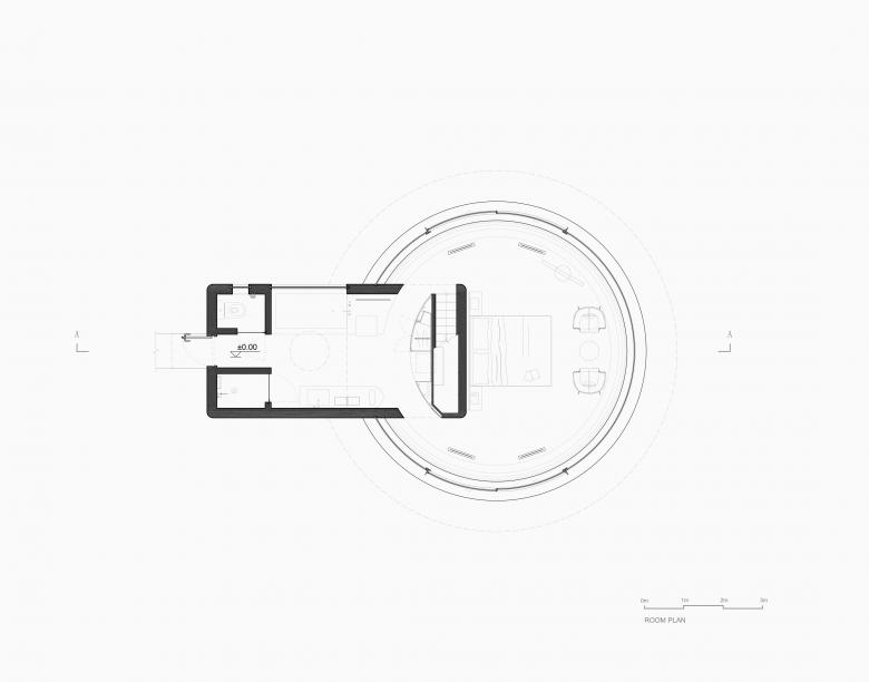 The architectural form of the Mushroom is composed of two simple volumes according to the functions. The main part of the mushroom is the guest room space, with a panoramic window set up near the viewing height. When sitting on chairs or leaning on the bed, the guests are immersed in the surrounding nature. The loft serves as a child area, linked by the small-scale stairs. The pure white cone-shaped roof is rounded on top, creating a sense of unbounded extension to the space.
