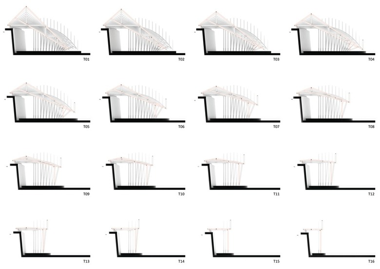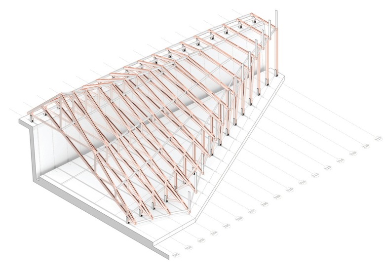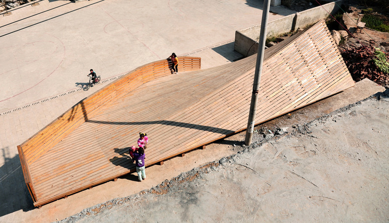 As a Knowledge Exchange Project, the construction involves collaboration with a local timber manufacturing factory. The process resulted in the development of a surprisingly diverse form through simple means. A series of trusses is anchored between the upper road level and lower plaza level. The form of each truss changes to create both a gradual incline (to bring people down) and then a sharp upward pitch (to elevate the roof). The trusses were covered in an aluminium waterproofing layer and timber decking. On the interior, the trusses extend downward to support a floating bookshelf. Simple traditional school benches are used as chairs. The polycarbonate doors can open to create a completely open space extending out to the plaza