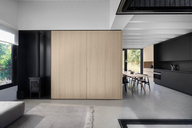 Custom furniture and integrated cabinets accentuate the graphical quality on the inside. The design team made use of simple materials like natural oak wooden panels -- or stained black to combine with the rough pinewood facade -- and a continuing polished concrete floor. They strived for a design strategy in which architecture and interior come together in a model combination.
