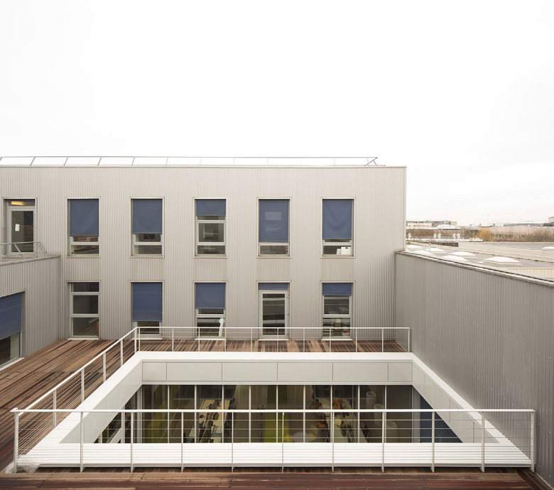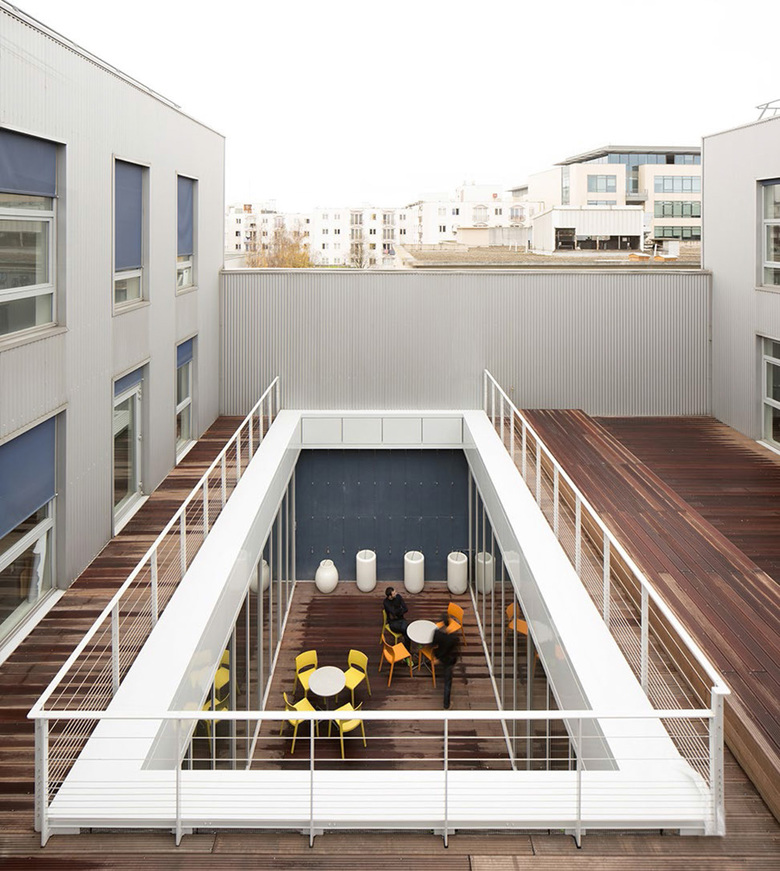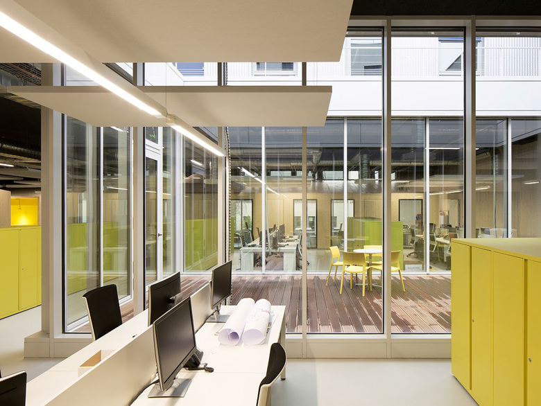 Cut from the mass of the volume of the old storage room, the patios provide controlled natural light. Blurring the frontier between outdoor and indoor spaces, they offer a framing of the sky and highlight the depth and intimacy between open office spaces.
