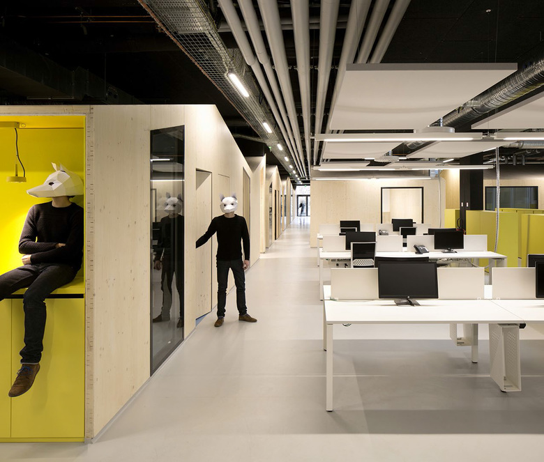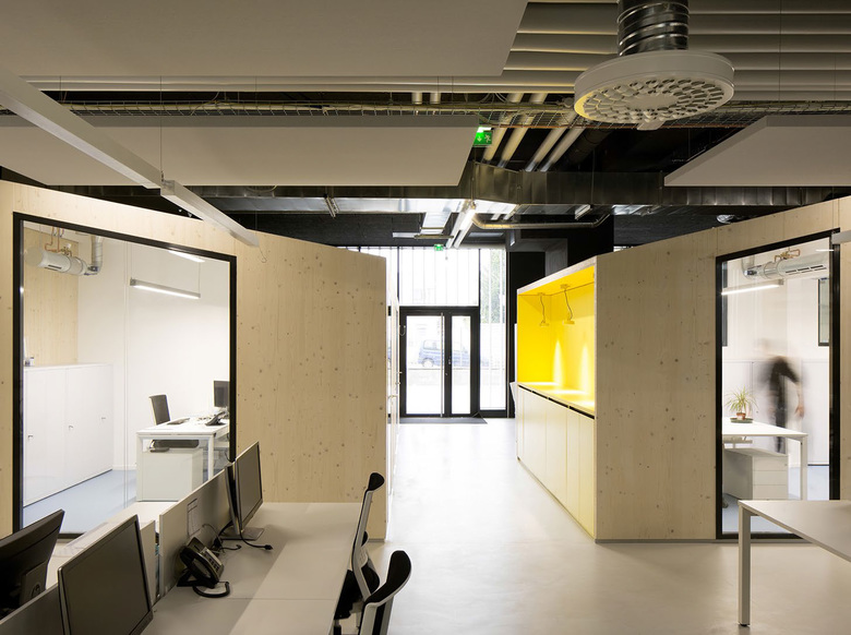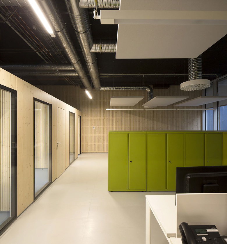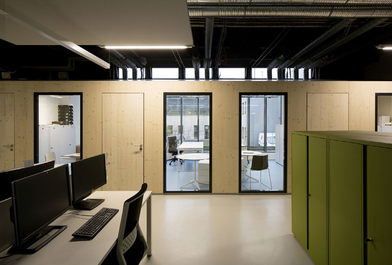 Favoring a playful and warm atmosphere, offices and meeting rooms are made of structural wooden panels. Prefabrication through digital machining of these elements enabled rapid implementation on site without the need for lifting equipment.