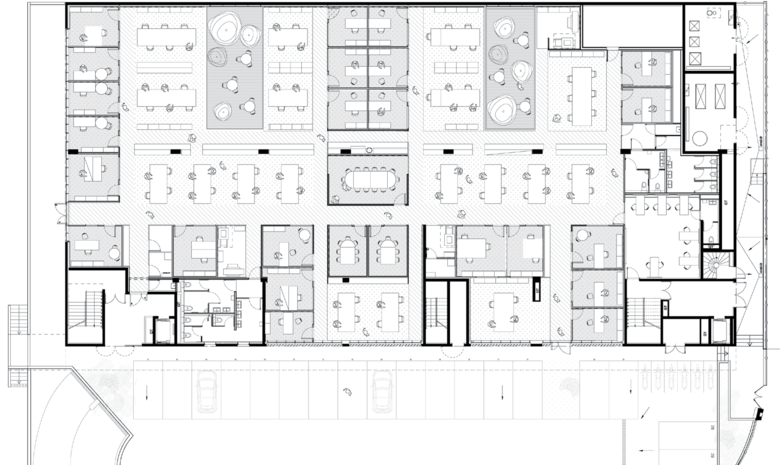 The transformation of a warehouse into offices immediately raises the question of natural lighting and thermal comfort. We considered the size of the volume (60m x 30m x 4.3m) and the scarcity of façade openings as so many positive constraints to structure the project in two main interventions: creating closed spaces using prefabricated timber and opening two exterior patios.