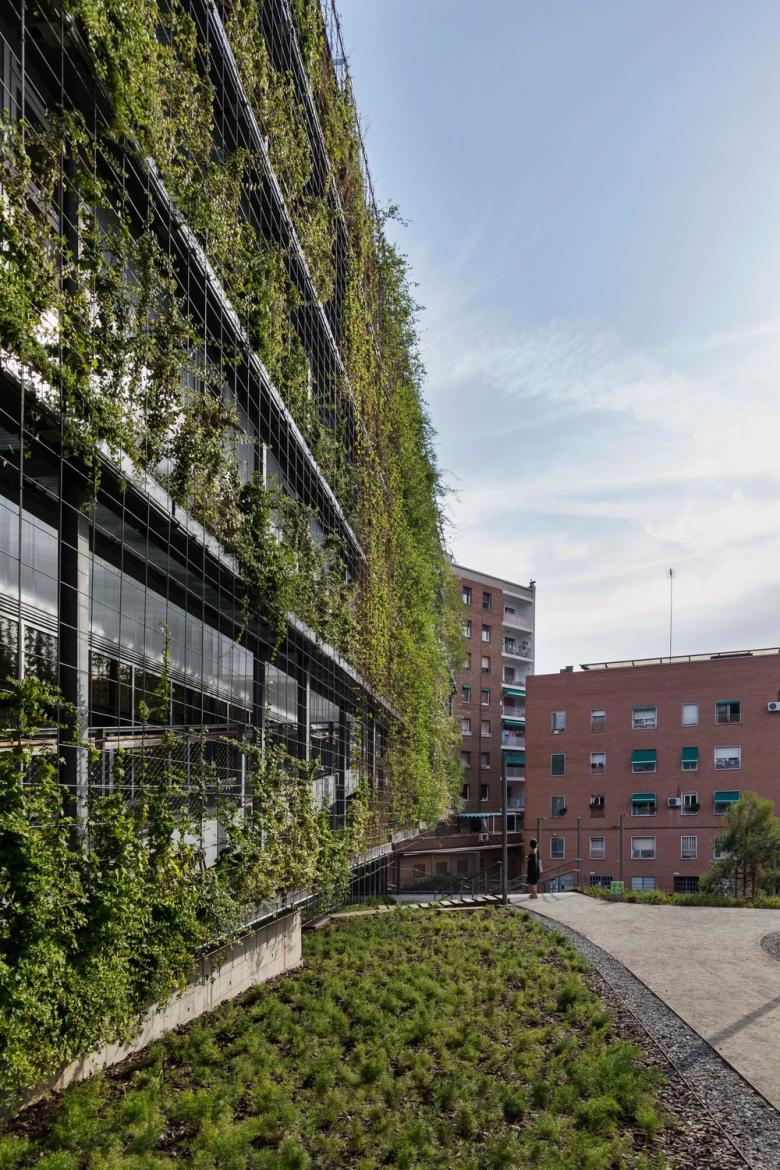 A green gallery surrounds the building protecting it from the sun and creating a bioclimatic space. The plantation system is hydroponic, chosen for its lightness, the durability of the substrate, the capacity of water retention and ease of installation. From the court, the entire green facade is perceived through the curtain wall, enjoying its flowering changes according to the time of the year.