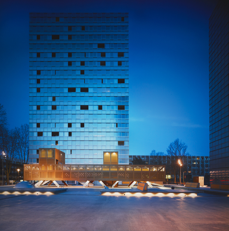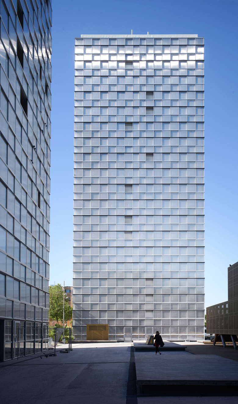 From the outside the buildings are characterized by patterns and color change, based on the reflections of light, standing up as individuals within the urban nightscape.