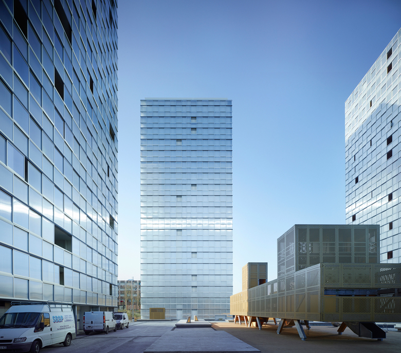 The movable wings attached to the glass balustrade animate the facade and optimize the climate efficiency and the acoustic qualities of the building. From the outside the buildings appear light and create a highly visible landmark for this new district. The design answers to the specific requirements of the location and offers a new better solution for the residents.