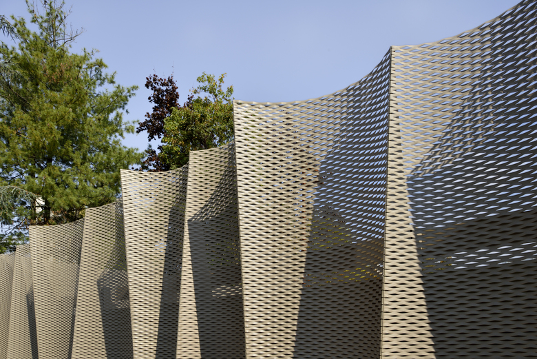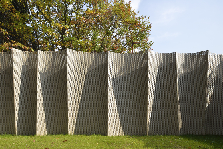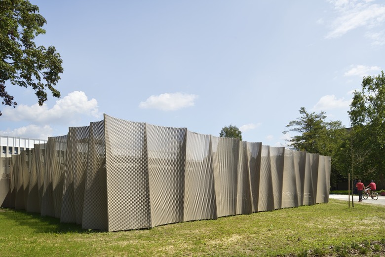 The form of the car park adapts to the surrounding landscape. The slight branching out in the floor area design reflects the siting of the building among the existing trees, which had all been left intact. The front facade of the building features a very restrained design and references the simple shapes of other buildings in the immediate vicinity. The remaining circumference of the car park is covered by an expanded-metal facade skin of slightly more relaxed design. Its height is matched to that of the public program at the front facade and it is also just tall enough to obscure cars on the upper level. Individual facade panels are parabolically bent out of the building plane. Beside the interesting shape, the result is also great static strength, which obviates the need for any additional supporting sub-construction. The repetition and careful arrangement of these lightweight facade elements produces a constant play of light and shadow, giving the building a soft appearance among the surrounding trees.