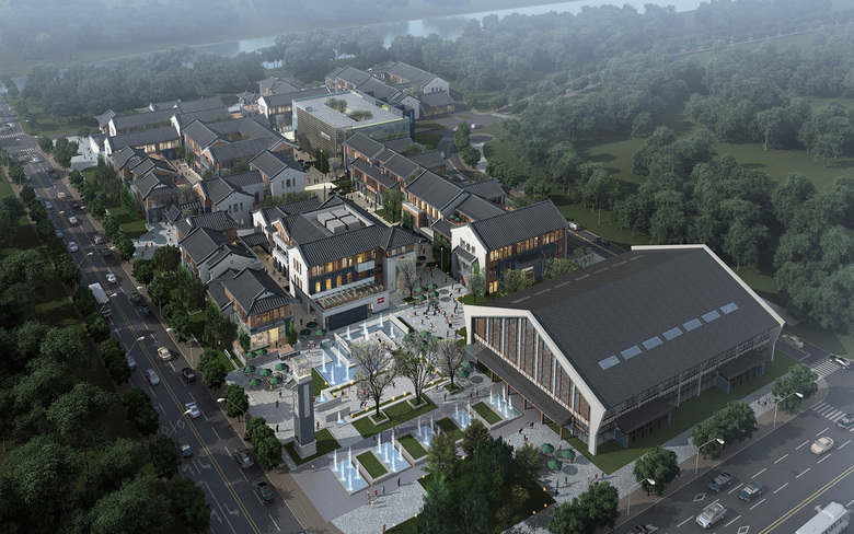 In this way, from both the inside of the Slender West Lake and the urban main road, due to the interruption from trees, the complex gives people an impression of slope roof and part of the elevation of the second floor, which perfectly accords with the very strict requirements for traditional appearance of this plot. And when visitors enter this commercial shopping street from entrance plaza, they will find that the clear façade is the best background for a variety of business activities. First floor is a carrier for modern commerce; second floor and the roof are carriers of tradition aspects. The base of first floor and the upper body are connected together through the same material and the division of elevations, to form a distinctive and harmonious whole scene. This strategy combines various plus factors to the greatest extent, which can meet the requirements of traditional aspects and the use of modern business facilities.