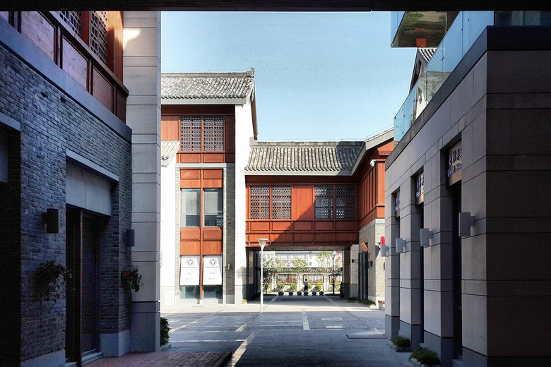 Commercial scenic district is usually associated with four groups of people: government, developer, local residents and visitors, each with different expectations. Government normally wishes to use archaic style because it has the lowest risk. However, commercial buildings with exactly archaic style have a relatively short width and small areas of windows, which do not meet the demand of modern commerce and is adverse to the developer. Therefore, Shanghai Dushe employed a strategy that could satisfy the expectation of each group as far as possible: processing the construction of the first and second floors separately; using traditional method only to recover the roof and the decoration of the second floor are mainly based on hardwood rose windows and wood veneers, taking the essence of the traditional style; the design of first floor is stone curtain wall, using large areas of display window to meet the needs of modern commerce.