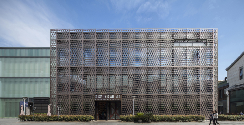 Dushe aims at technology development of Hongqiao Shopping Street. For example, normal blue brick metope uses ‘stick’ method, which is easy to whiskering by time. In order to overcome this disadvantage, Dushe adopts a new method called dry-hang construction method, which is a simple dry-hang measure to separate the surface of the blue brick and the primary wall. This method prevents the whiskering, and the cost of construction increases only by 10%. The entire architecture uses curtain wall method to ensure the final completion. The façade of No.8 building employs hollowed-out decorative aluminum alloy curtain wall with U-shaped glass. Its modern image contrasts with the surrounding architecture, which brings out the best in each other.