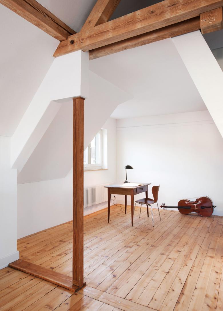 Beim Innenausbau wurden die bestehenden Oberflächen wo möglich belassen oder wo nötig lediglich sanft erneuert. Die alten Tannenrimenböden in den oberen Geschossen und das bestehende Treppenhaus wurden geschliffen und geölt und das ganze Haus mit natürlichen, mineralischen Farben gestrichen. Alle Sanitär- und Elektroinstallationen wurden integral erneuert.