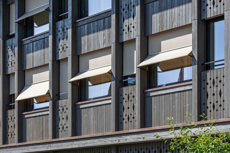 Die Bewohner des Generationenhauses verbringen viel Zeit in ihren Wohnräumen. Die Ausstellmarkise SUNLUX® 6013 bietet einen wirksamen Schutz gegen die sommerliche Wärme und gleichzeitig eine gute Sicht nach aussen. Der beige Stoff transportiert eine warme Atmosphäre in den Innenraum und passt farblich zur Holzfassade. Die Ausstellstore ist sehr windstabil und erfüllt die Anforderungen an Minergie P.