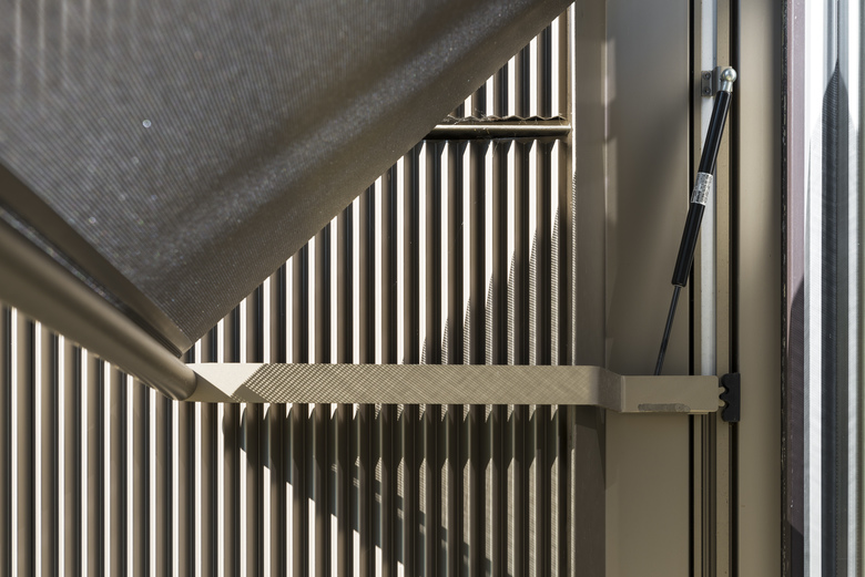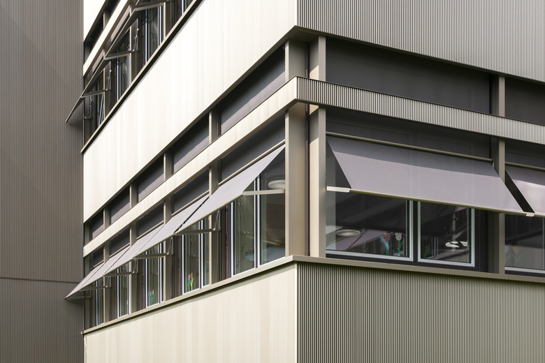 Sanierung Gebäudehülle. Zum Witterungsschutz wurde die Fassade mit Metallpanelen eingekleidet. Die windstabilen Ausstellstoren wurden in der gleichen Farbe eloxiert.