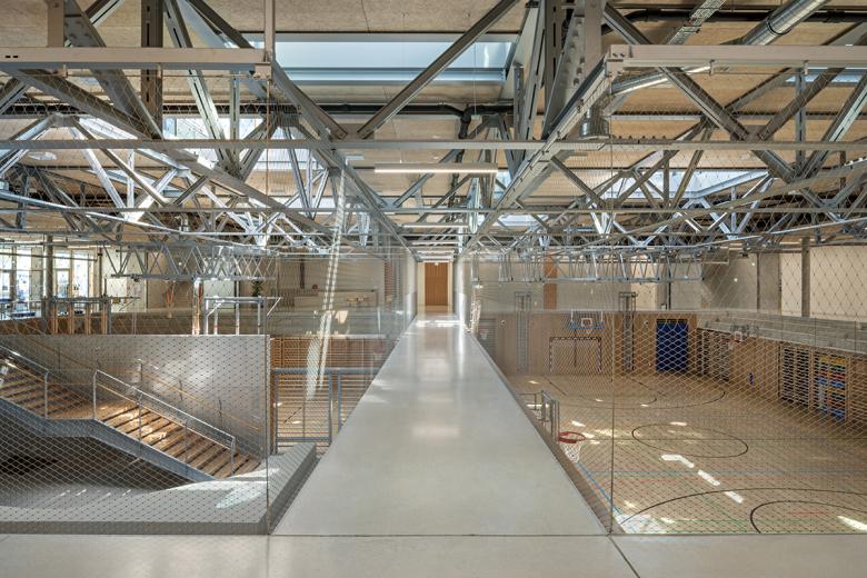 The focus of the new secondary school is on sports. The rooms adapted to the different activities – the common gymnasium, the gymnastics hall, the climbing wall – stretch over all levels, from its floor level in the basement to its roof terrace on the first floor.