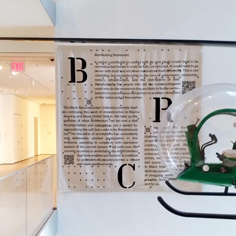 As part of Reconstructions: Architecture and Blackness in America, now on display at MoMA, a sign bearing Philip Johnson's name has been covered by the manifesto of the Black Reconstruction Collective.