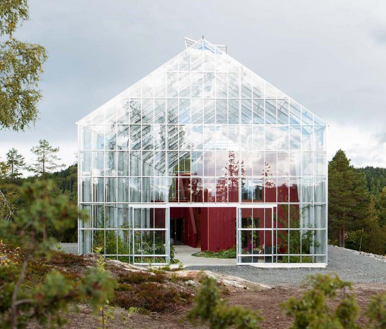 Height of a giant greenhouse in Norway, in a village west of Drammen and Oslo, that encloses a house designed by...