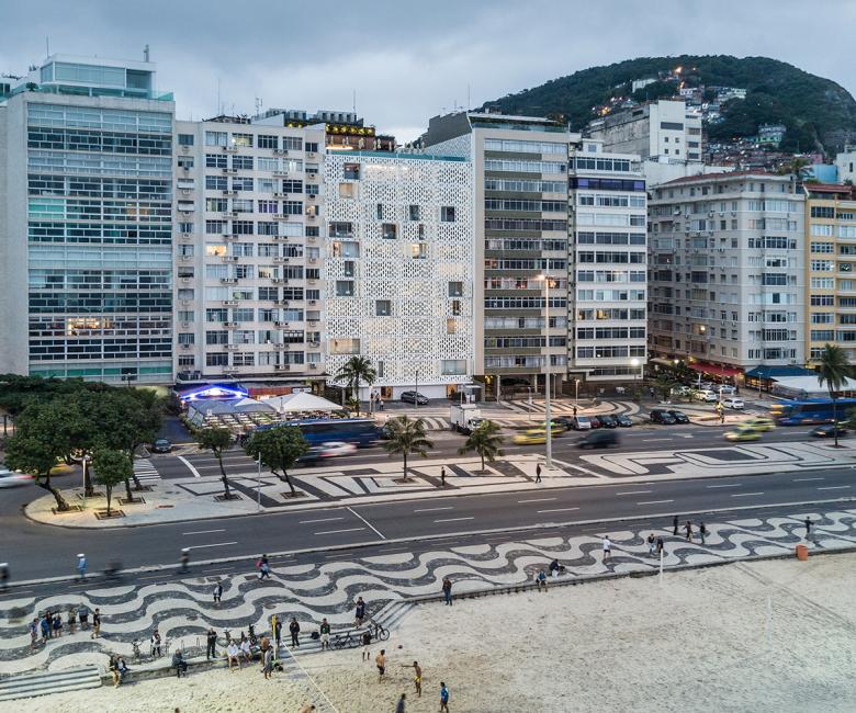 Designed by Chad Oppenheim and Arthur Casas, the Emiliano Hotel sits on the famed Copacabana beach in Rio de Janeiro. The project fronts one of the most beautiful views in the world while being surrounded on three sides by dilapidated apartment buildings from the 1950s.