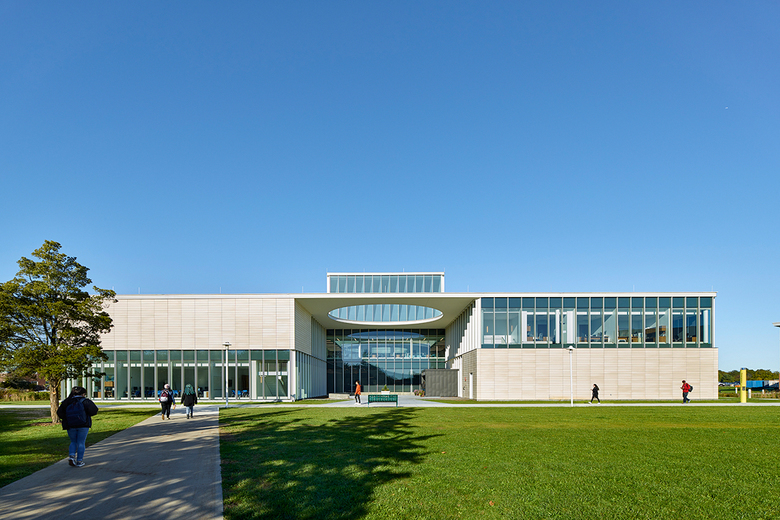 The Learning Resource Center is an innovative state-of-the-art library that provides a vibrant collection of study spaces organized around a dramatic social stair on the Michael J. Grant Campus of Suffolk County Community College in Brentwood, New York.