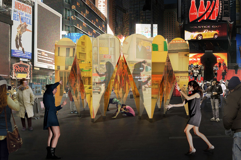 Collective-LOK's design featuring "a faceted ring of golden, mirrored hearts to create a kaleidoscopic pavilion that multiplies the spectacle of Times Square" has won the invited competition for the 8th annual pavilion celebrating Valentine's Day.