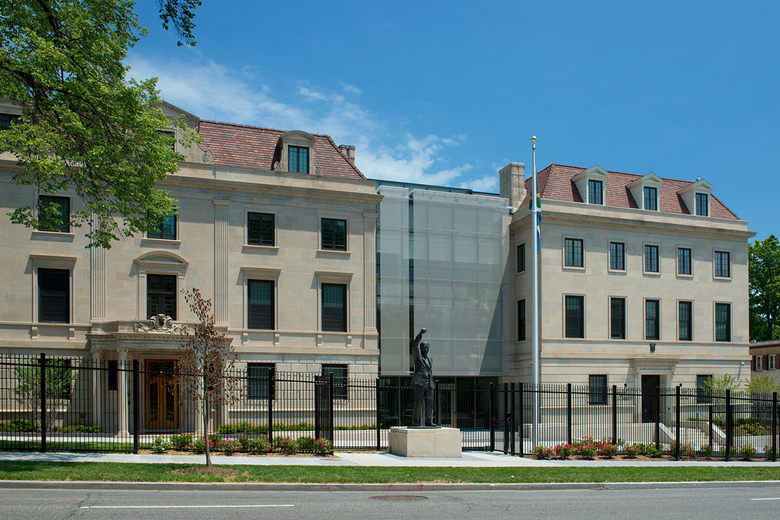 As part of Davis Brody Bond's modernization of the Embassy of South Africa, the architects inserted a glass addition between the Dutch Cape-style buildings, using Cambridge Architectural mesh to shade the interior and express a "New South Africa."