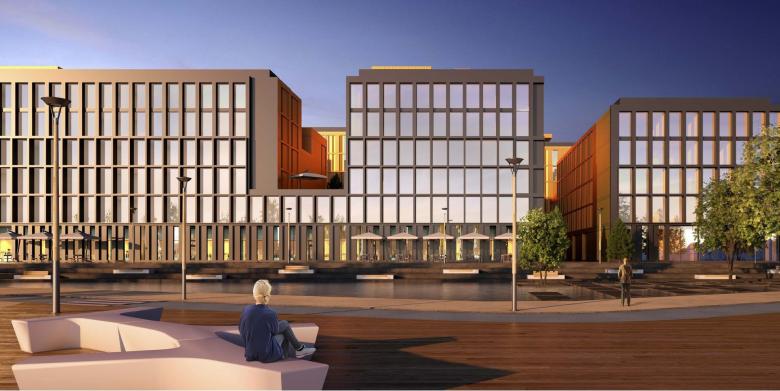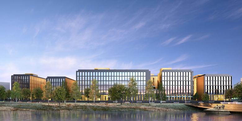 An apartment complex on the shores of a city lake