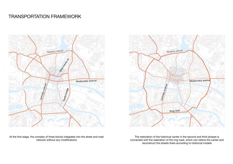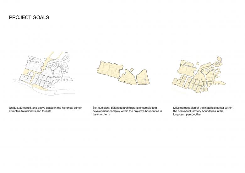 The successful development of the historic center is intrinsically tied to the city's strategies for transforming its transport and recreational infrastructure. A comprehensive approach to developing the surrounding areas is equally essential. The historic center should be developed using unique models that deviate from modern development templates. It should exemplify the synergy of active functions and authentic urban spaces.