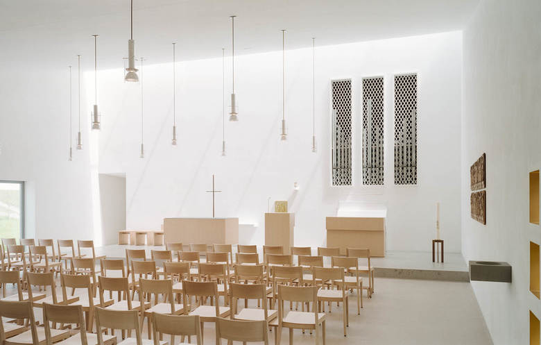 Der Eingang auf der strassenseitigen Fassade wird mit einer perforierten Eingangspartie aus bronzefarbig eloxiertem Aluminium markiert. Nach durchschreiten des Vorraums öffnet sich ein schlichter sakraler Raum mit Blick in den Garten. Das geneigte Dach findet den Abschluss über dem Altarraum mit einem durchgehenden Oblichtband. Dieses lässt zenitales Licht in den Kirchraum eindringen. Der Kirchenraum soll klar und einfach gehalten ein Ort der Ruhe und Besinnung sein. Der angrenzende Gemeinschaftraum kann durch Öffnen der Faltschiebewände direkt mit dem Andachtsraum verbunden werden. Ein separater Zugang erschliesst den unterteilbaren Gemeinschaftsraum und die Nasszellen unabhängig vom Andachtsraum. Die Sakristei kann von aussen direkt über den umlaufenden chaussierten Weg erreicht werden. Die Fensterfront zum Garten lässt sich auf die ganze Länge öffnen und ermöglicht einen Gottesdienst im Freien. Die Kirchenglocke ist über dem Orgelraum platziert.