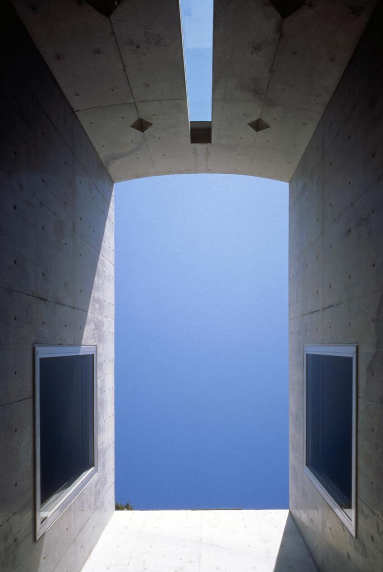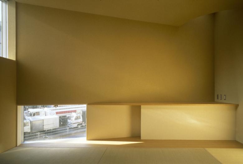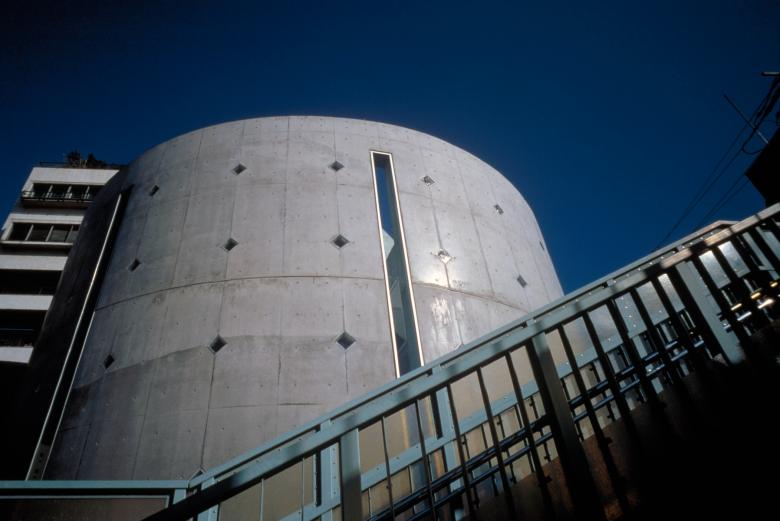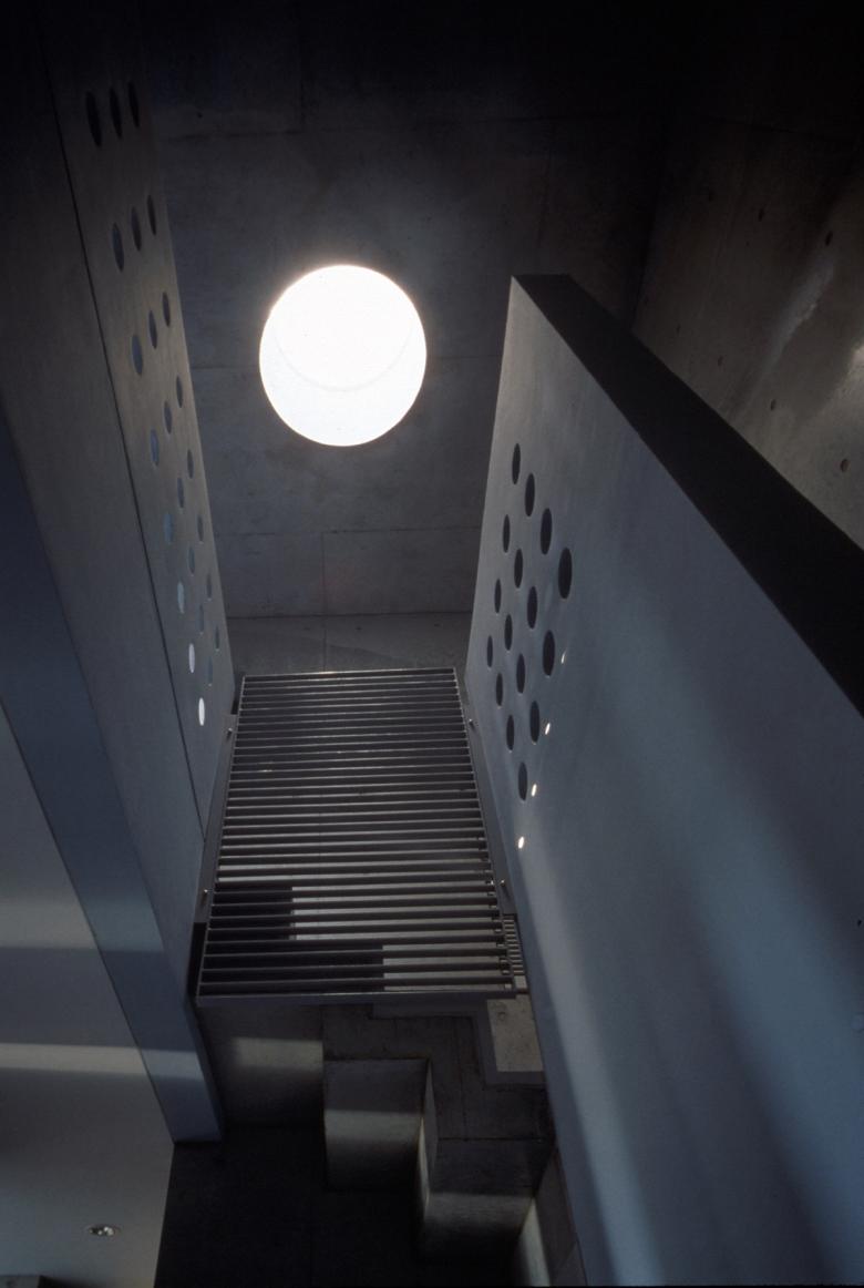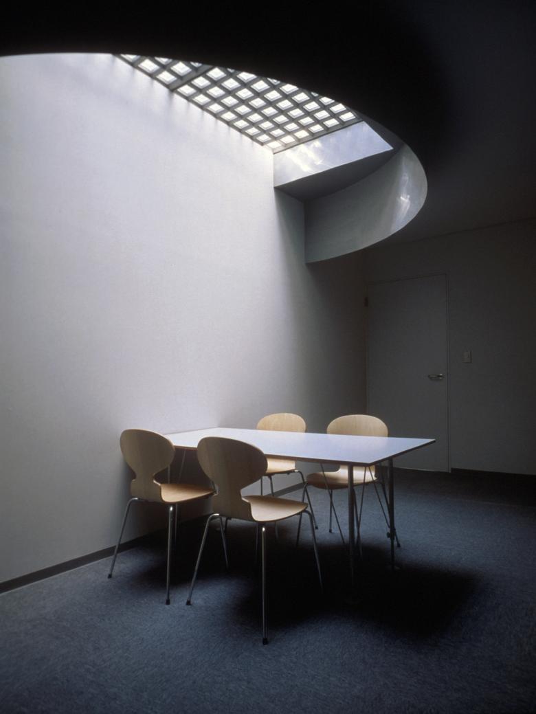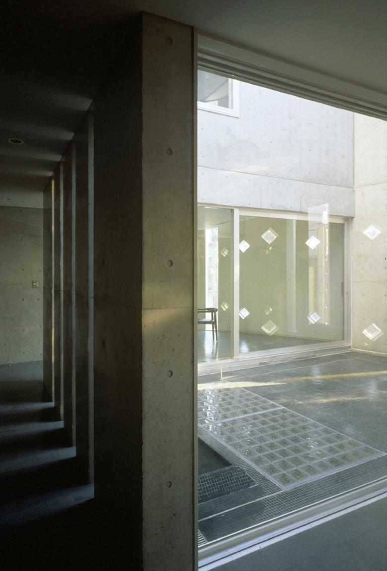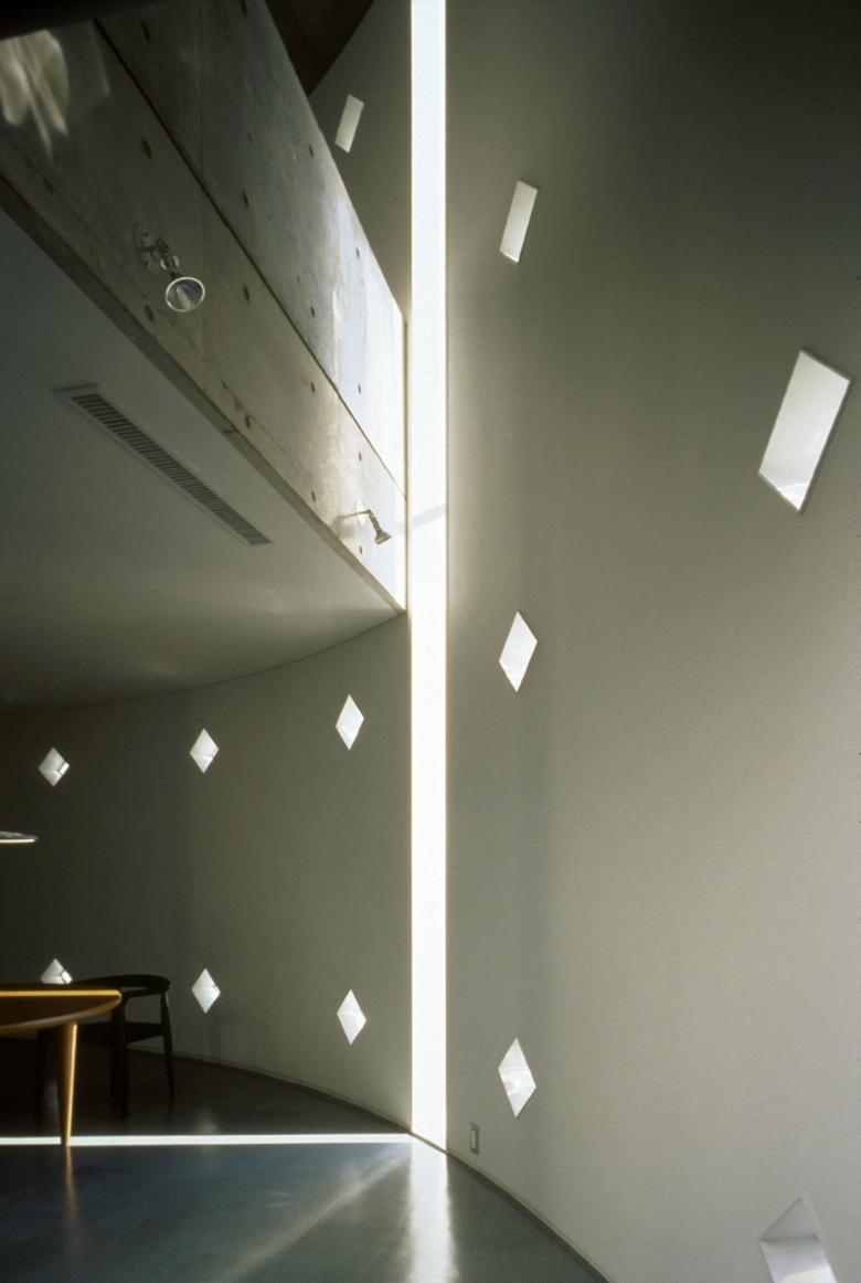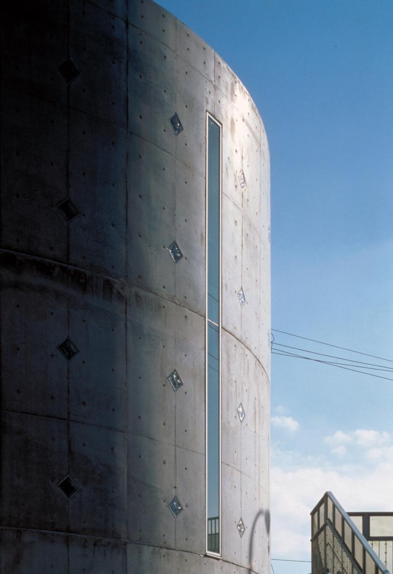 The building takes the form of a semi-cylindrical cylinder constructed from thick concrete, creating an abstract and powerful expression. Natural light streams into the consultation rooms and waiting area in the basement through skylights encircling the cylinder, creating a calm and bright space. A courtyard is situated at the centre of the second and third floors, which serve as residential quarters, delivering soft light to the main rooms. Furthermore, through the glass blocks and slits regularly dotted across the exterior walls of the cylinder, flickering light and strong, linear light continuously impart a fresh character to the interior spaces as the sun moves across the sky. Additionally, light passing through the prism glass in the courtyard creates a serene, underwater-like atmosphere in the hall below. The aim of the project was to create a building that, in response to the adverse external environment characterised by noise, vibration and exhaust fumes, uses the power of the ever-changing sunlight to liberate the interior space from these constraints and transform it into a richly evocative space suited to each specific area.