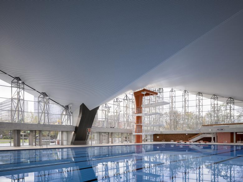 The original aluminum trussed columns of the glass facade have been retained. gmp, sbp, and Implenia Fassadentechnik also developed a new building-code-compliant telescopic piston support system that forms a flexible connection between facade and roof; this makes it possible to compensate for oscillating movement of the roof shell. The surfaces of the retained building components were restored to recreate the original face concrete appearance, using elaborate restoration techniques, or returned to the original former color scheme. Construction elements such as the historic acoustic tiles were restored and reinstalled. The architectural identity of the indoor pool facility was retained whilst striking a balance between preservation, functional redesign, and meeting changes in user demand, thus ensuring the pool’s long-term functionality and operation.