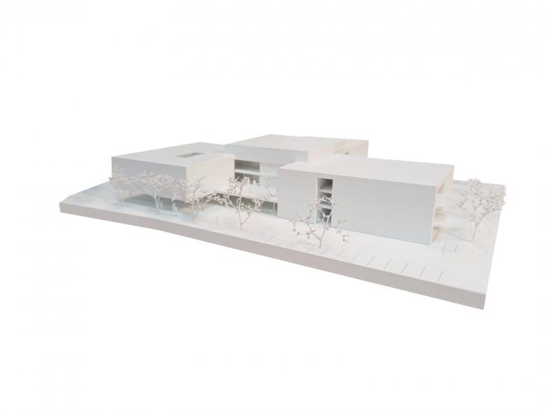 Das Seniorenheim gliedert sich in seinen 3 Baukörpern erdgeschossig in 2 Trakte für das Hausgemeinschaftswohnen sowie in einen öffentlichen Bereich, in dem Foyer, Verwaltung und die Küche untergebracht sind. Der zentrale Foyer- und Veranstaltungsbereich bietet eine nordseitige, überdachte Terrasse sowie einen südseitigen direkten Ausgang in den Garten.