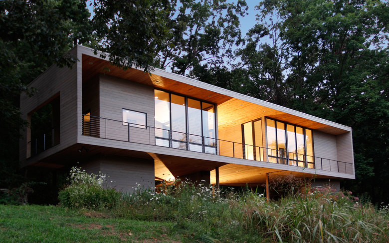 Bridge-Studio is a new artist studio building in Easton, Pennsylvania, designed for a couple who are both artists and gallery owners in New York City. Bridge-Studio houses a painting studio for the husband on the east side, and a writing studio on the west side. An open air breezeway runs through the center of Bridge-Studio, connecting back to the site with an entry ramp to the north. Bridge-Studio is entered by walking up the entry ramp, into the open breezeway overlooking the Delaware River, approximately 120 feet below the site.