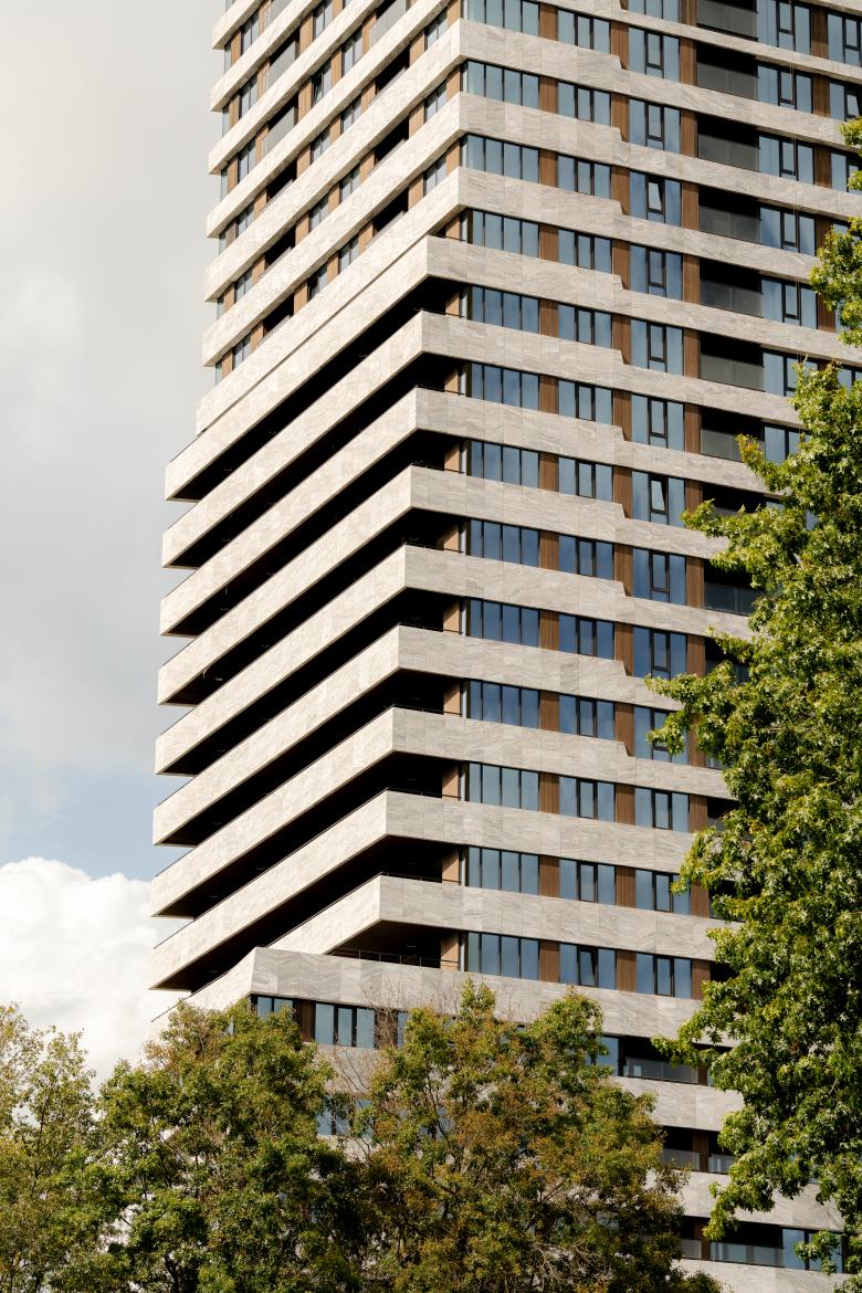 The residential tower offers 210 high-end rental and owner-occupied apartments over 32 floors. These combine spacious floorplans with huge windows framing extraordinary views, luxurious natural materials, and loggias and balconies. Up to the 18th floor, DELVA added greenery into the integrated planters of the balconies, connecting to the Bunker Park.