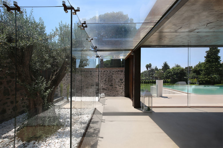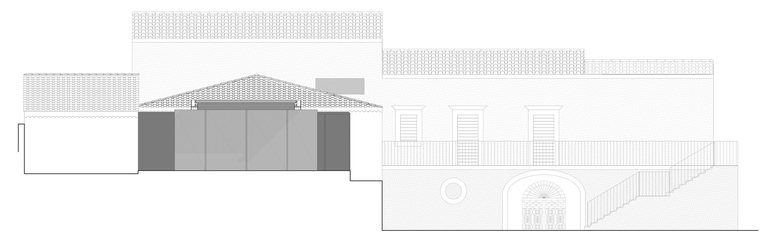 The veranda - made of steel profiles and glass - is a small building extending an old millstone, where they used to process the grape: the addiction interacts with the historical masonry thanks to the corten brownish colour. The peculiar aspect is the sliding movement of the roof that offers radically variable space, extent of shelter, sunlight and insulation. It is about the ability to vary or connect the overall building composition and character according to season or weather. During the wintertime, it will be possible to close the building, thanks to the kinetics of the roof, the glass windows and the pivoted walls. During the summertime, the whole structure will be open, banishing the separation between interior and exterior.