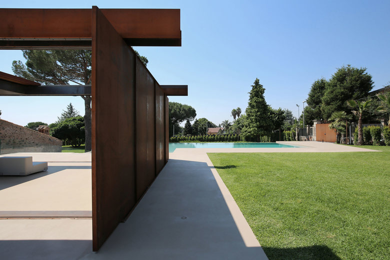 The main entry – an avenue coated in hand-crafted stone - resumes the ground of an old path. Passing through two centuries-old cypresses, it guides to several green terraces - confined by thin blades made of corten steel - and leads to the new veranda.
