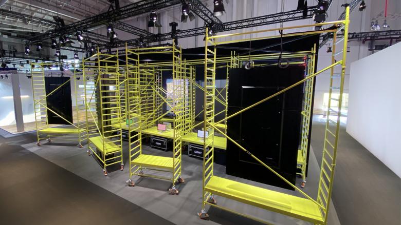 Simple and strong - few elements like neon-colored scaffolding and LED screens characterize the booth design. A mirror wall mounted along the entire length only appears as a complete reflection of the stand upon closer inspection – in particular the mirrored scaffolding creates the perfect illusion of an extension of the space.