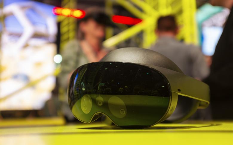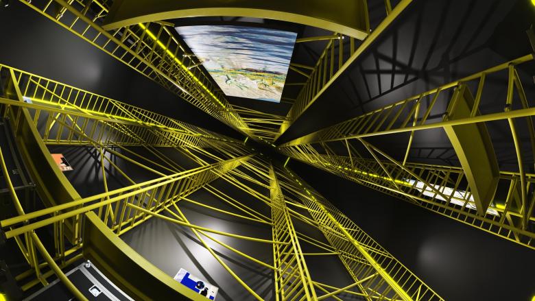 The doubling of the scaffolding structure leads to the main idea of IN BETWEEN's concept: possibilities for immersive experiences created in the fusion of physical and digital reality. Similarly, when first entering the Virtual Reality Experience, the characteristic neon-colored scaffolding extends in all directions into virtual space. Symbolically, the real environment in which visitors find themselves expands.