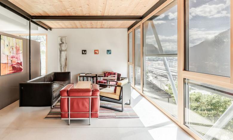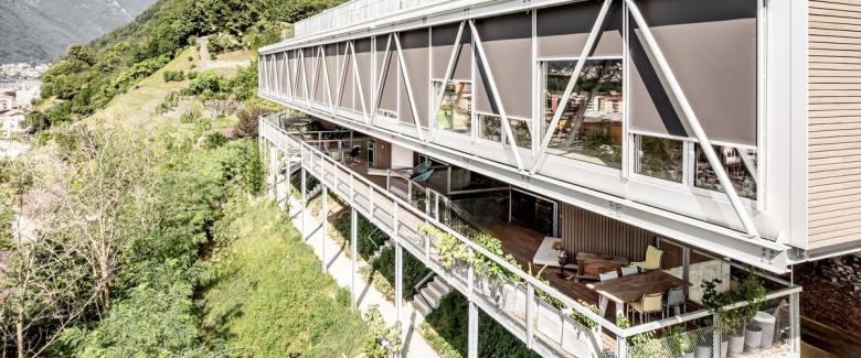 On a hill above Bellinzona, "D-Vision" was created as a modern residential project that combines design and sustainability. The four exclusive residential units rest on reinforced concrete pillars and offer a 180° panoramic view over the Ticino valley with 283 m² of glass surfaces.
