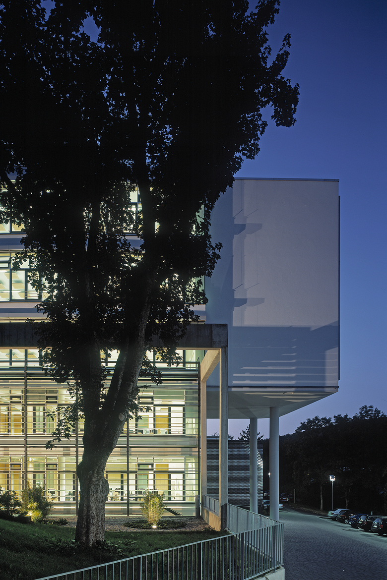 Das bestehende „Schulzentrum am Hang“ wird am südlichen Gebäudeende ergänzt durch den quer zum Hang ausgerichteten Erweiterungsbau unter Beibehaltung der bestehenden Gebäudehöhen. Die kompakte Lösung trägt den ökologischen und ökonomischen Gesichtspunkten Rechnung, wobei eine Differenzierung im Inneren und im Äußeren die Identifikation der Schüler fördern soll. Die Baukörper sind nutzungstechnisch eindeutig ablesbar. So zeichnen sich im zweigeschossigen Sockel die Fachräume ab, die zum baulich gefassten Patio orientiert sind. Darüber legt sich ein dreigeschossiger nach Süden orientierter Klassentrakt, der nach Osten auskragt. Verbunden werden die beiden Baukörper durch das fünfgeschossige nördliche Erschließungsbauteil, das gleichzeitig als Bindeglied zum Bestand genutzt wird. Dieser Bauteilausbildung entsprechend kommen zwei architektonische Prinzipien zur Anwendung. Zum einen die Verzahnung von Sockel und Patio mit dem Naturraum und zum anderen das „Loslösen“ des Klassentraktes von der Natur, um diese zu inszenieren. In den beiden Sockelgeschoßen ist eine behindertengerechte Verknüpfung mit dem zentralen Foyer gegeben, die sich im 1.Obergeschoss mit den Verkehrsflächen des Bestandsbauteil B zu einer Runderschließung ergänzt. Durch die Übernahme der Gebäude- und Geschoßhöhe von Bauteil B können mit dem Aufzug alle Ebenen, sowie das Vorplatzniveau behindertengerecht erreicht werden. Durch das Querstellen des Erweiterungsbaus zum Hang entstehen zwei neue Außenräume mit unterschiedlichen Qualitäten. Zum einen entsteht im Norden ein Hof zwischen dem Erweiterungsbau und dem Bestand, der als Pausenfläche genutzt wird und durch Sitzstufen sowie einer Baumbepflanzung aufgewertet wird. Zum anderen entsteht im Süden ein Patio mit kontemplativer Atmosphäre, der den Ausblick in den Wald wie auch auf die Villa Klingspor inszeniert.